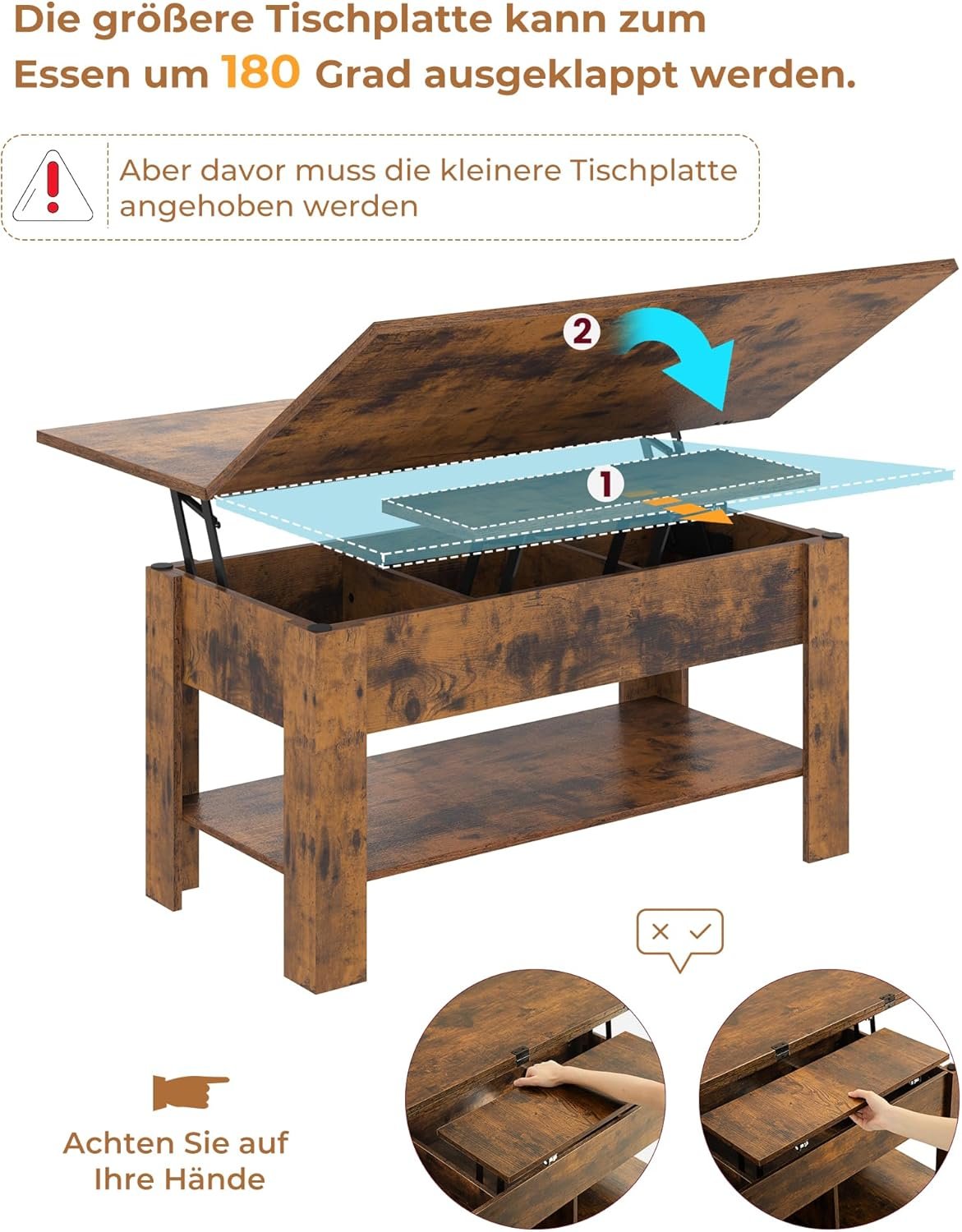 • Solid and durable: the coffee table is made of high-quality MDF board and a sturdy metal lifting mechanism, ensuring the smoother height adjustment and high load capacity. In addition, there is a cut-out handle on the side of the waterproof and durable table top, which makes opening the height-adjustable coffee table easier and prevents finger injuries. The L-shaped wooden legs increase stability and reduce wear on the floor