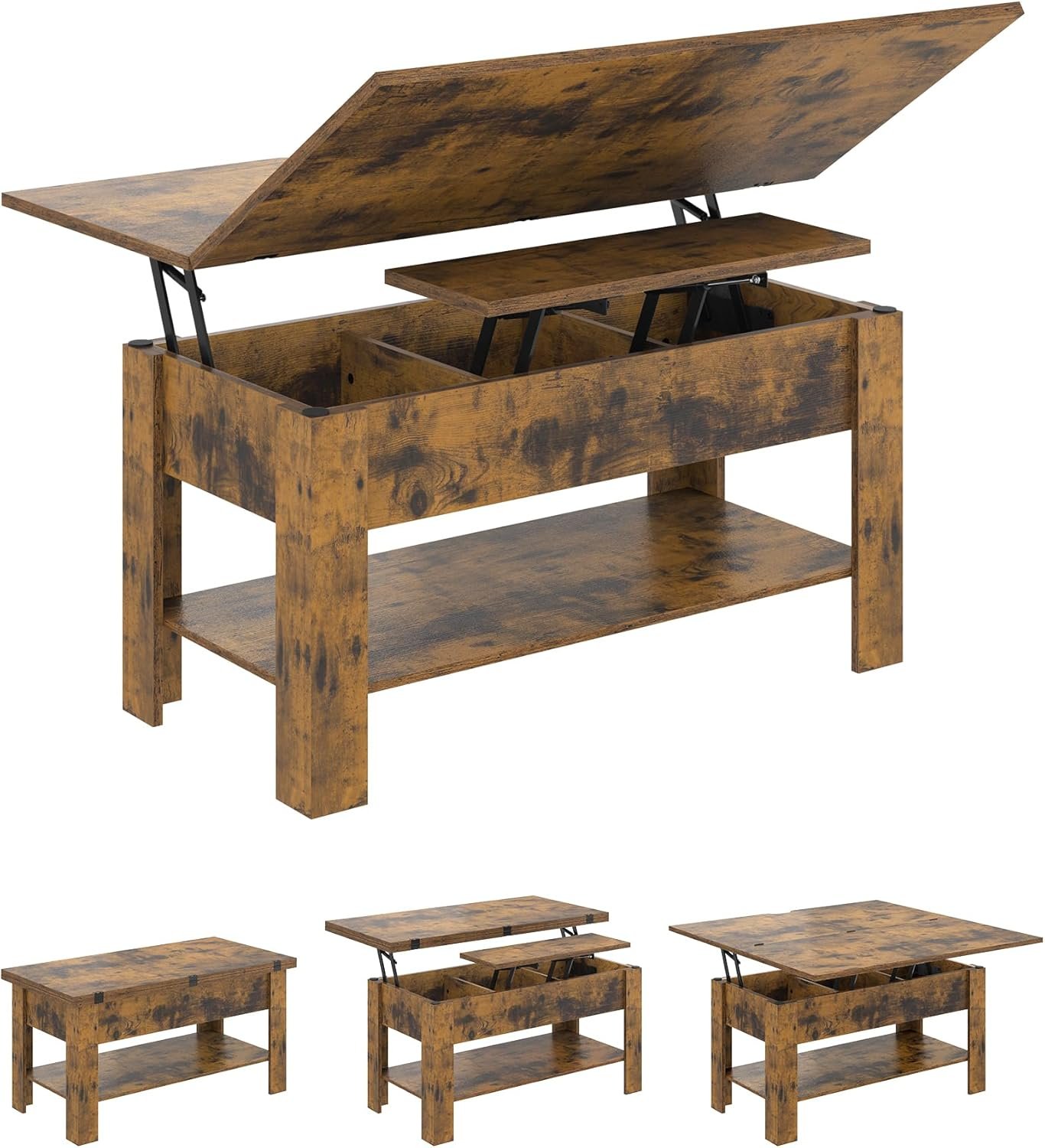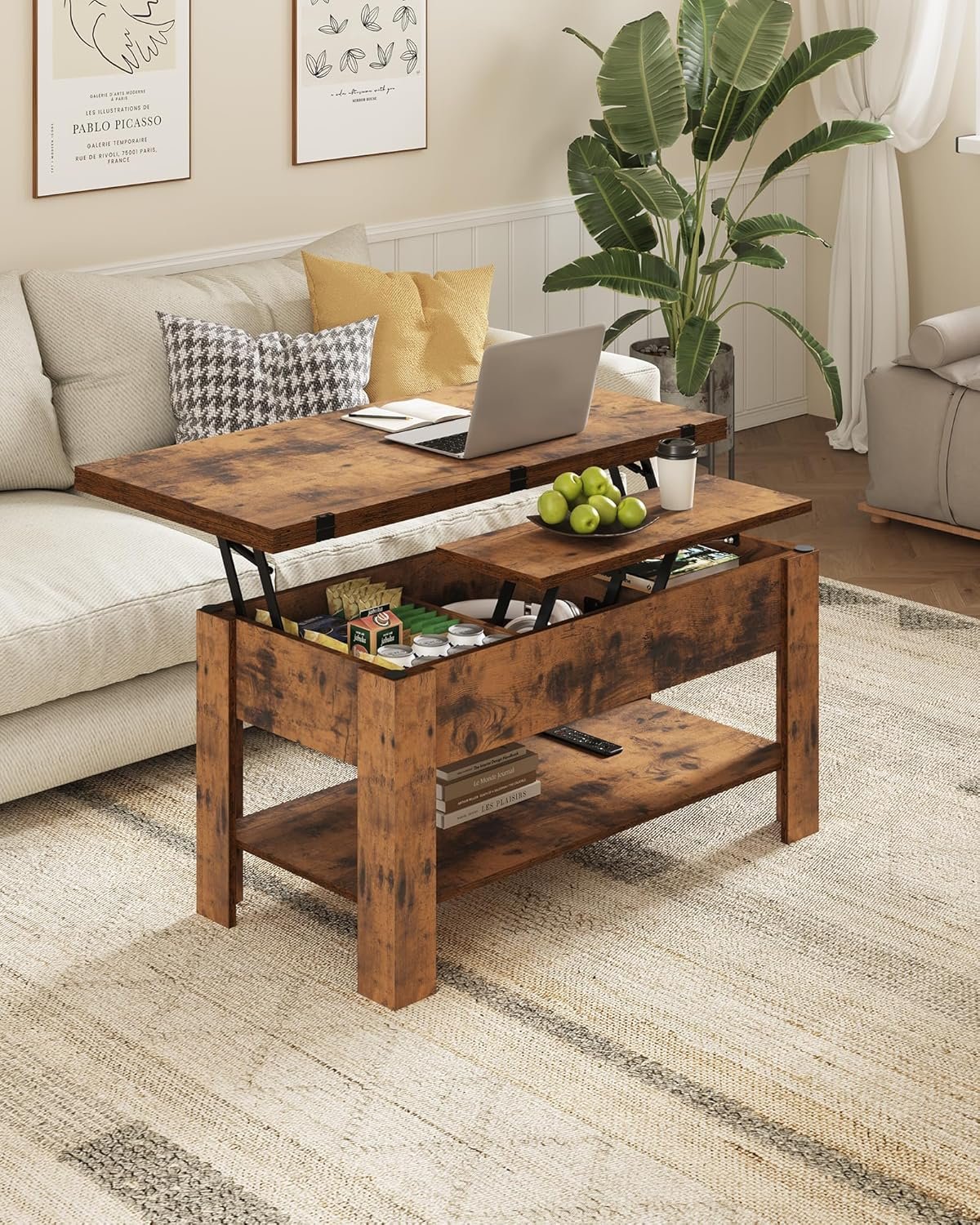 • Sufficient Storage Space This coffee table provides plenty of storage space. Under the table top there is hidden storage space. Underneath there is an open shelf on which you can place storage boxes, decorations or books